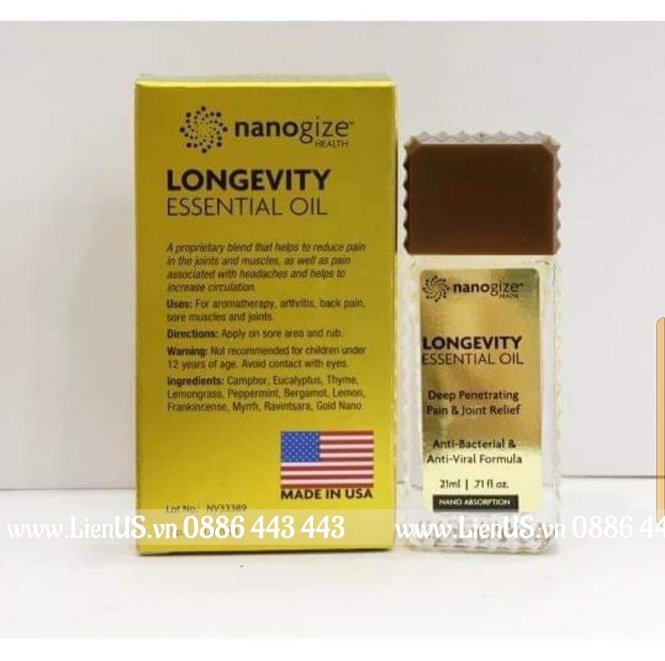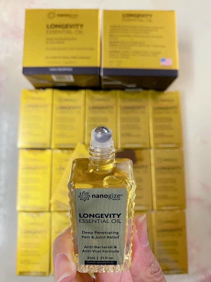 Dầu vàng NANOGIZE – LONGEVITY ESSENTIAL OIL giúp khắc phục một số điều kiện gây ra đau như viêm khớp và đau cơ bắp. Tinh dầu giúp làm giảm đau, cải thiện lưu thông máu đến khu vực đau, và giúp làm giảm viêm gây ra cơn đau. tinh dầu Nano thường được sử dụng để làm giảm đau đầu, đau cổ, và cũng giúp giảm căng thẳng và lo lắng khi áp dụng cho các khu vực bị ảnh hưởng.